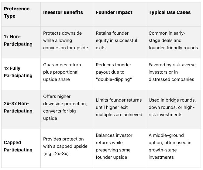 Here’s a quick overview of the main types of liquidation preferences and how they affect investors and founders differently: