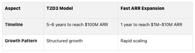 T2D3 vs. Fast ARR Growth: T2D3 takes 5–6 years to hit $100M ARR, while Fast ARR Expansion aims for $1M–$10M ARR in 12 months or less.
