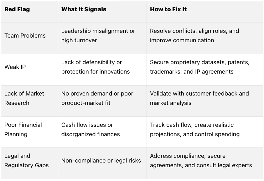 Legal and Regulatory Gaps: Missing compliance or legal oversights can scare off investors.