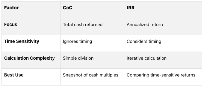 CoC measures the total cash returned compared to the initial investment. It’s simple and focuses on absolute returns, often expressed as a multiple (e.g., 3×). However, it doesn’t consider the timing of returns.