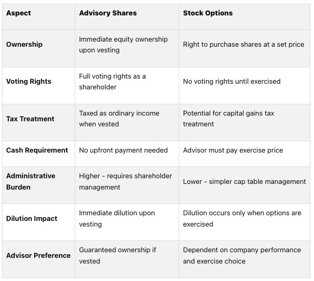 Deciding between advisory shares and stock options can significantly impact the advisor's ownership experience and your company's cap table. Each option has its own pros and cons, depending on your startup's stage and the advisor's preferences.