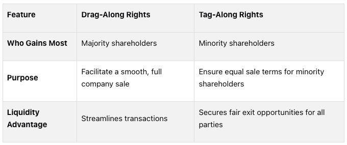 Expanding on earlier discussions, let's break down how drag-along rights and tag-along rights serve different purposes in shareholder agreements. Drag-along rights allow majority shareholders to push for a full sale of the company, while tag-along rights protect minority shareholders by letting them join a sale under the same conditions. These mechanisms are essential tools for creating fair and functional agreements between founders and investors.